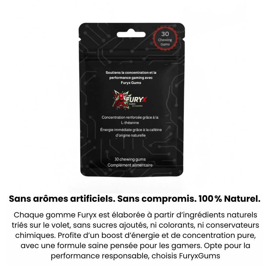 Chaque paquet de FuryX Gums contient 30 chewing-gums. Parfait pour durer tout au long de vos sessions de gaming ou de travail !