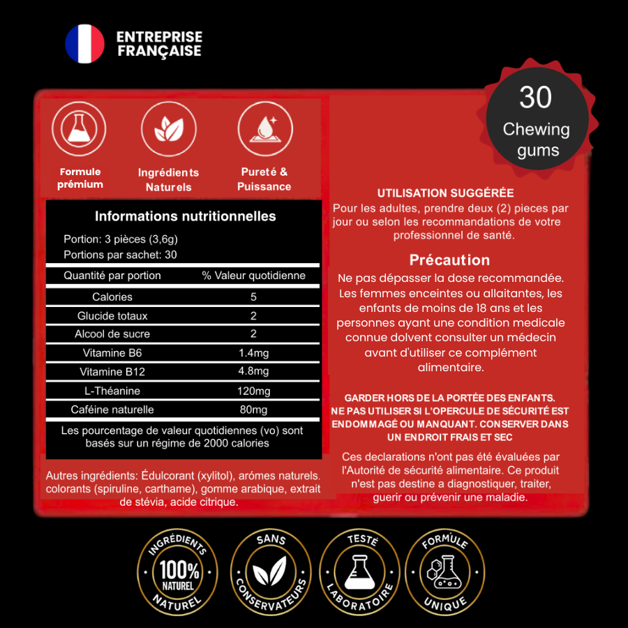 L-Théanine : 120mg Caféine naturelle : 80mg